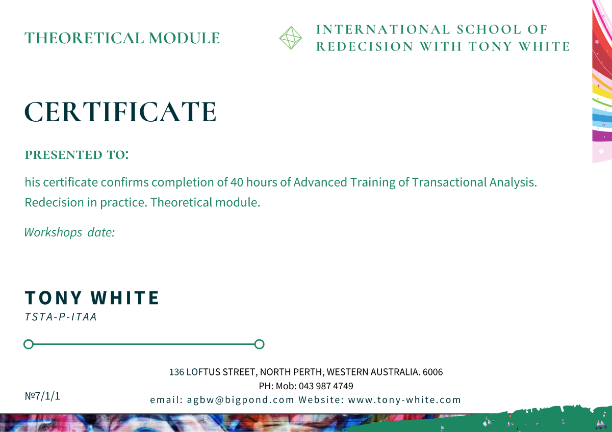 Международная Школа Перерешения с Тони Вайтом - это курс повышения квалификации CPD для специалистов в Транзактном Анализе с последующей сертификацией. Часы Advanced TA Training.